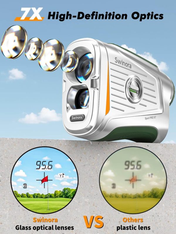 - 【1300Y Accuracy + 7X Zoom】This golf rangefinder with slope delivers +/-0.3 yard precision from 3 to 1300 yards. The anti-glare 7X lens and ultra-clear LCD display provide sharp visuals even in bright daylight. Built-in slope switch makes it tournament legal, while still offering true slope compensation when enabled