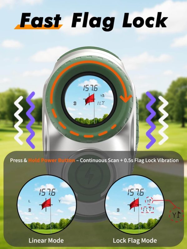 - 【Flag Lock Mode】Built for competitive golf, Flag Lock ensures reliable pin targeting within 250Y. Long-press for a stable scan that locks the flag in 0.5s with vibration feedback. Long-press minimizes hand-shake error, while single-click favors over stability